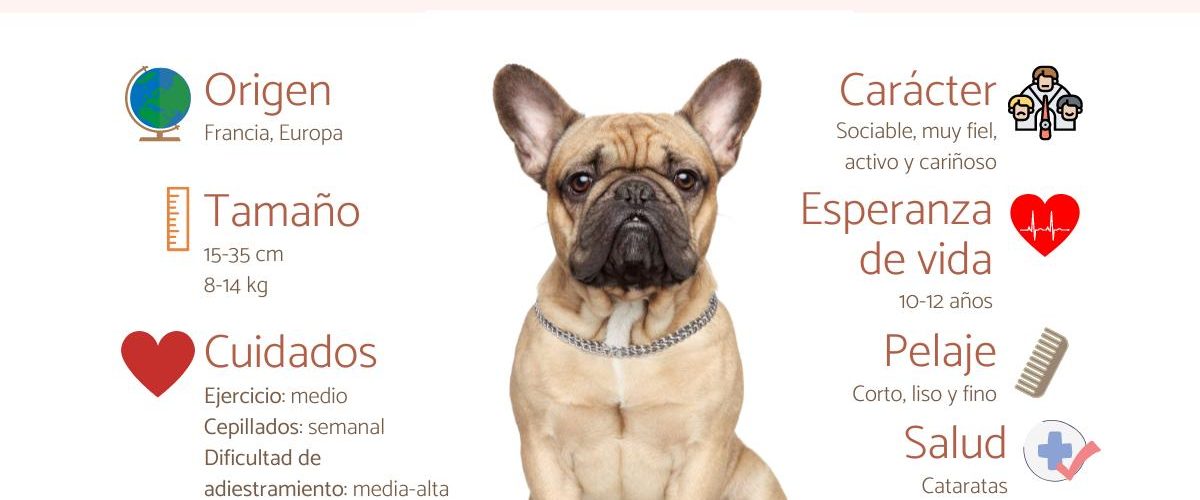 - Bulldog francés: Es un perro de tamaño pequeño, con una cabeza grande y redonda, orejas grandes y erguidas, y una mandíbula inferior prominente. Tiene un cuerpo musculoso y compacto, con patas cortas y cola corta o ausente. Su pelaje es corto y su temperamento es juguetón y cariñoso.