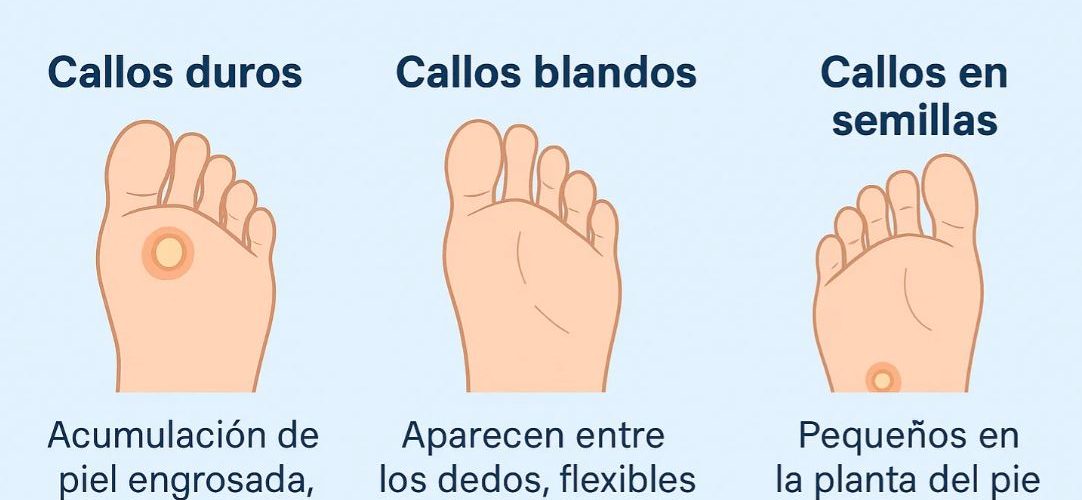 Los diferentes tipos de callos que pueden formarse en los pies son callos duros (formados por una acumulación de capas de piel muerta en áreas de presión), callos blandos (más suaves y húmedos, causados ​​por la fricción constante entre los dedos o alrededor de las uñas) y callos vasculares (causados ​​por problemas circulatorios).