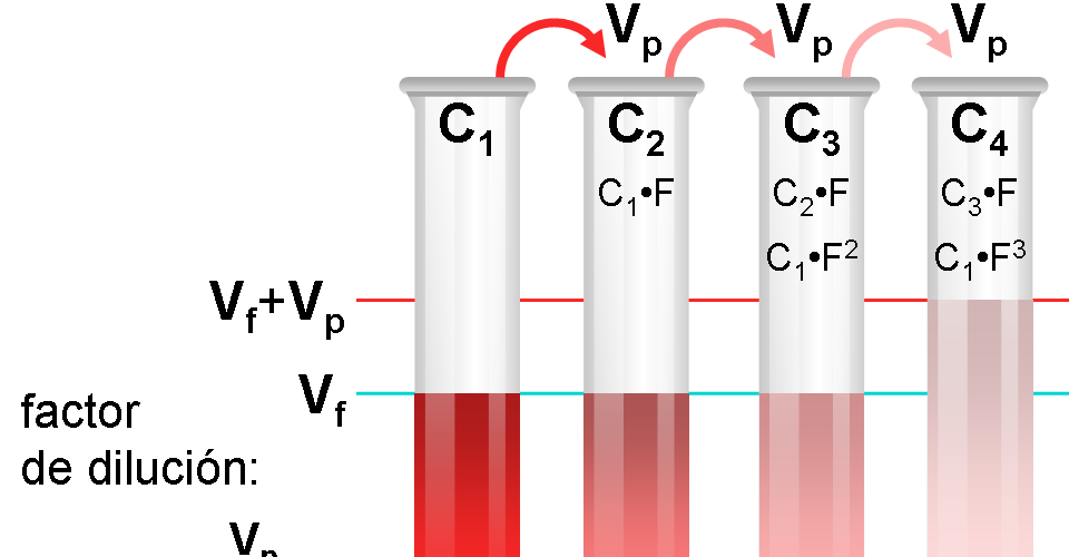 Dilución en serie: En este caso, se realizan diluciones repetidas utilizando una solución diluida anteriormente como base para la siguiente dilución. Por ejemplo, si se necesita una dilución de 1:100, se toma una muestra de la solución original y se diluye 1:10, luego se toma un volumen de esta solución diluida y se diluye nuevamente 1:10.