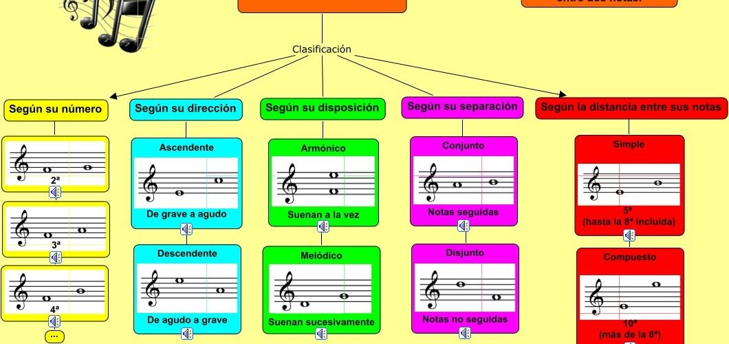 Estos intervalos pueden ser clasificados según su tamaño (mayor, menor, justo, aumentado o disminuido) y su nombre (unísono, segunda, tercera, etc.).