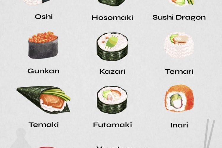 Existen diferentes tipos de sushi que se pueden encontrar en los restaurantes japoneses. Algunos de los más comunes son: nigiri (bola de arroz cubierta con trozos de pescado crudo), maki (rollos de arroz envueltos en alga nori con rellenos como pescado, mariscos o vegetales), sashimi (trozos de pescado crudo sin arroz), temaki (cono de alga nori relleno de arroz y otros ingredientes), uramaki (rollo invertido con el arroz por fuera y el alga nori por dentro), entre otros.
