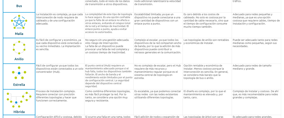 Estas son las principales topologías utilizadas en redes de computadoras. Cada una tiene sus ventajas y desventajas, y la elección dependerá de las necesidades y recursos disponibles en cada caso.